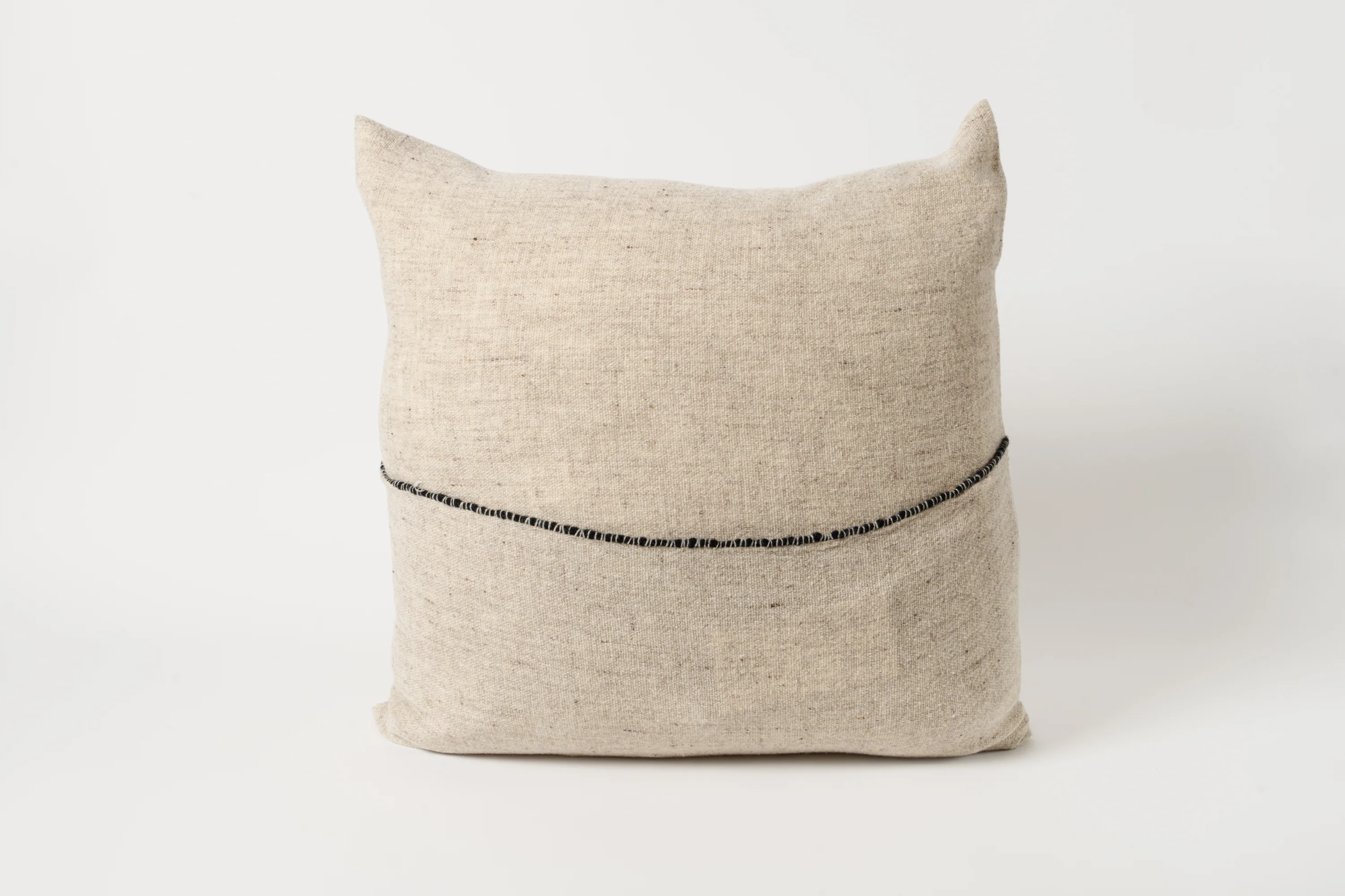 One-of-a kind pillow made with vintage cereal sack hand woven by women of Miranda do Douro, Portugal, situated on the boarder with Spain, the oldest border of Europe near the Douro river. The once forgotten treasures have a second chance at life and transformed into a pillow full of stories and tradition. The pillow is great thrown on the floor as a sitting solution on simple on the couch or bed. Linen and wool mix.